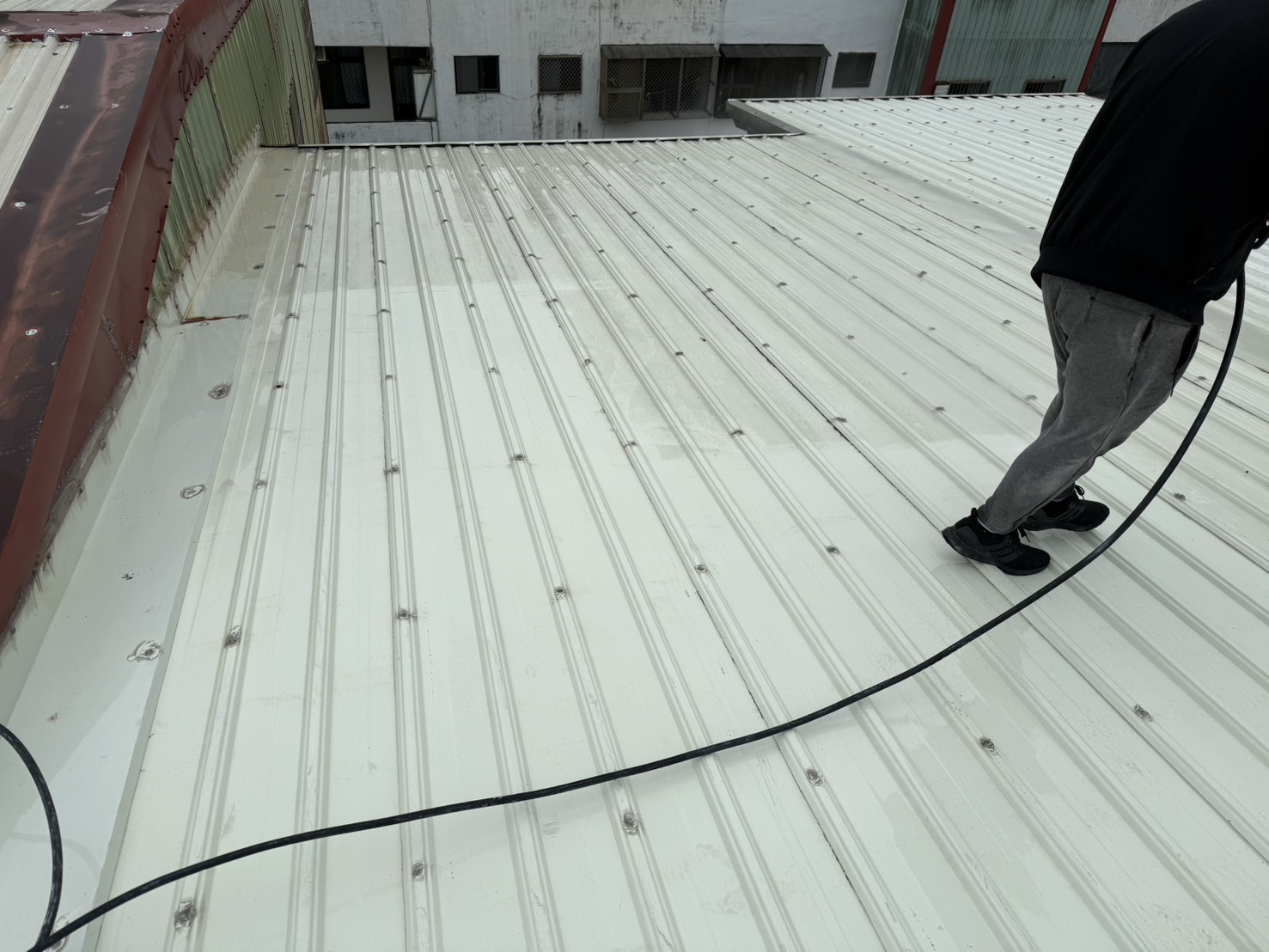 屋頂隔熱工程以高效隔熱塗料覆蓋鐵皮表面,有效降低太陽熱能吸收,改善夏季室內溫度過高問題,並同步提升屋頂防鏽耐候保護能力。